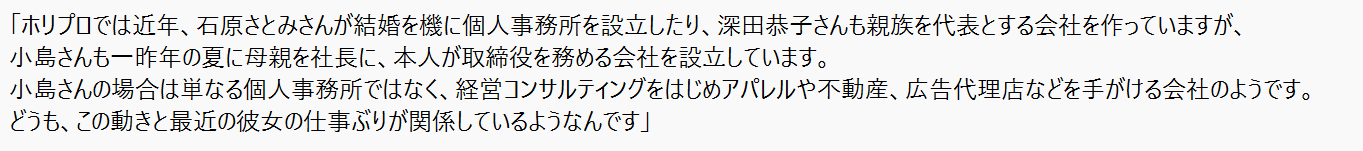 小島の中国進出を最初に報道した「女性セブン」によれば、『みむこじラジオ!』の終了は「事実上の“小島外し”だと囁かれている」とのこと。