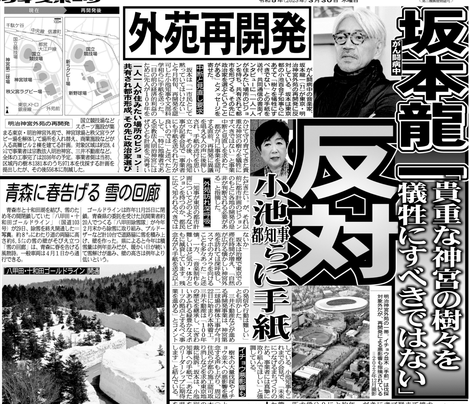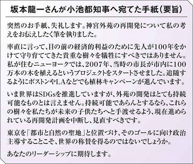 坂本さんは3月初旬、小池氏に送った手紙の中で「再開発を中断し、見直すべき」と抗議していました。「目の前の経済的利益のために、貴重な神宮の樹々を犠牲にすべきではない」と意見を述べています。さらには「住民ひとりひとりが住みたい場所のビジョンを持ち、共有されて都市の姿を形づくる。その先に政治家やリーダーを選ぶということがある」として、小池氏や永岡氏の政治観、国家観にも斬り込んでいました。