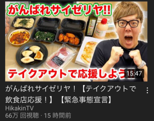 2021年1月22日「がんばれサイゼリヤ!【テイクアウトで飲食店応援!】【緊急事態宣言】」を投稿したHIKAKINさん。
