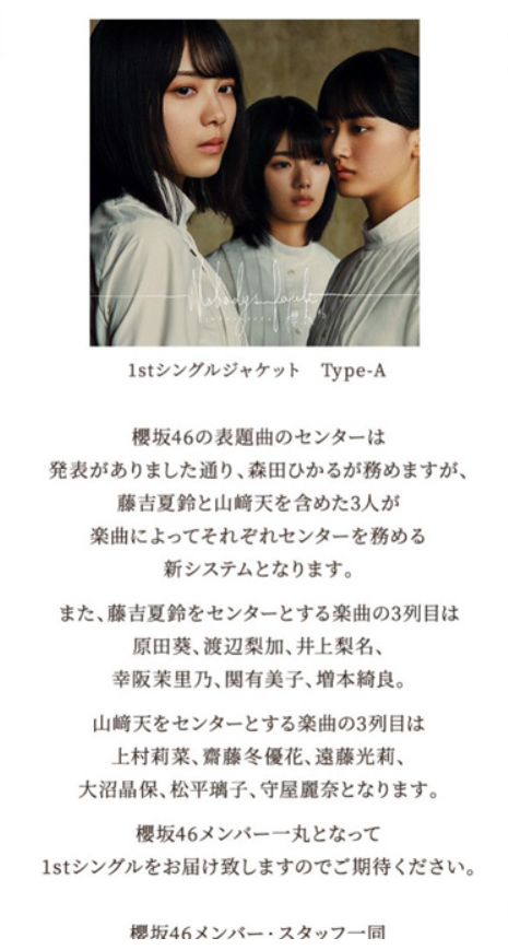 「運営によると、表題曲の 『Nobody’s fault』のセンターは森田ひかるが務めるものの、その他のカップリング曲は森田、藤吉夏鈴、山崎天の3人が楽曲によってそれぞれセンターを務めることになるそう。また、表題曲の選抜から外れたメンバーもカップリング曲では選ばれており、『櫻坂46メンバー一丸となって1stシングルをお届け致しますのでご期待ください』と呼びかけています。