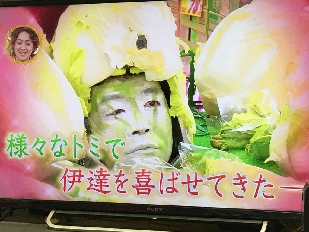 ほかにも、机と同化したり、スーパーで販売している白菜に扮したりと伊達を驚かせる富澤たけしさん。そんなロケの帰り道、車中で感想を話していると、突然窓の外に選挙カーが並走し始めました。看板に掲示されていたのは、リーゼントでバットを持った富澤たけしさんの高校時代の卒業写真。