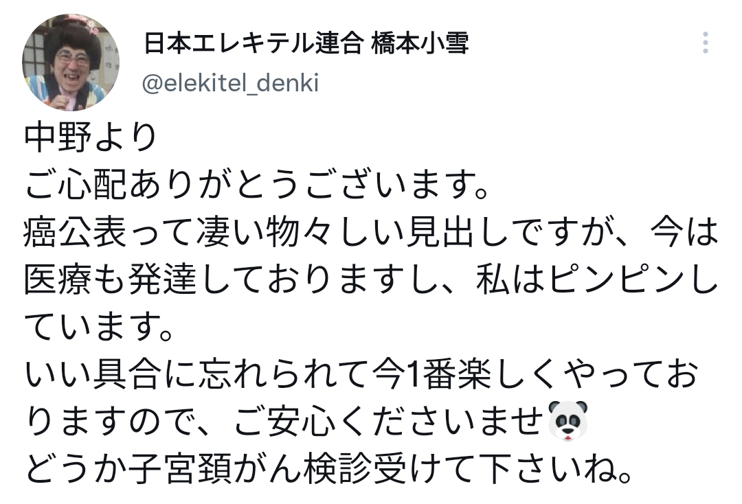 中野は相方の橋本小雪(38)と連名で所属事務所の公式サイトにて、「この度、12月に予定しておりました『日本エレキテル連合の坊ちゃん』を中止することになりました。理由は中野の子宮頸がんの治療のためです」と報告。 所属事務所の社長・太田光代(58)はサンケイスポーツの取材に応じ、がんの進行度について「検査中ですが、中程度より上」と説明しています。中野は体調不良を訴えて病院で検査を受け、今月14日にがんと診断されたようです。現在は入院せずに検査を続けており、今後の仕事はキャンセルし、治療のため近く入院する予定です。