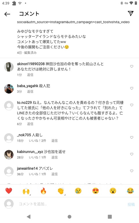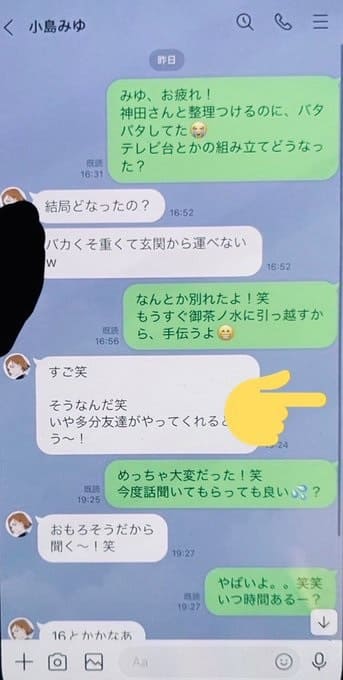 神田さんとのトラブルについて「めっちゃ大変だった!笑」「おもろそうだから 聞く~!笑」と返信するLINEのトーク画面がネット上に流出しており、前山さんと小島さんのやり取りだとして拡散されていました。