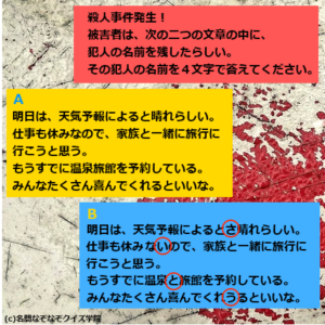 被害者は、次の二つの文章の中に、犯人の名前を残したらしい。