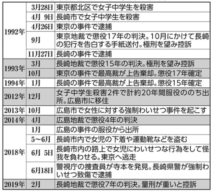 1992年に東京都と長崎市で女子中学生2人を殺害し、それぞれ懲役17年、同15年の判決を言い渡されて服役していた男が、出所後に移り住んだ広島市でも強制わいせつ事件を起こしました。そのあまりに卑劣な行為に、ニュースを見た人々は衝撃を受けています。