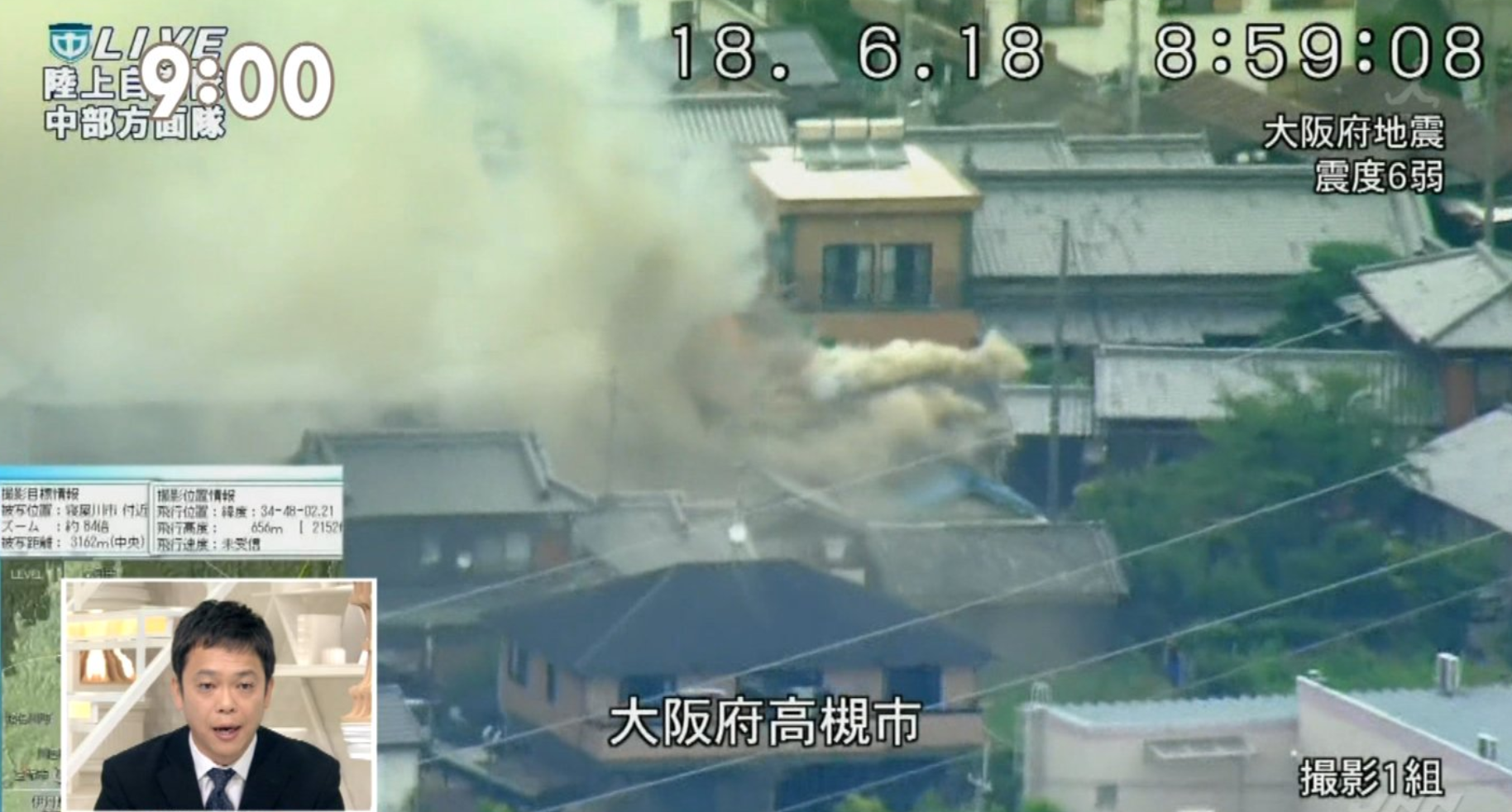 18日午前8時前、近畿地方で震度6弱を観測する強い地震があった。大阪府上空からの映像では、激しく燃える住宅火災の様子がわかる。