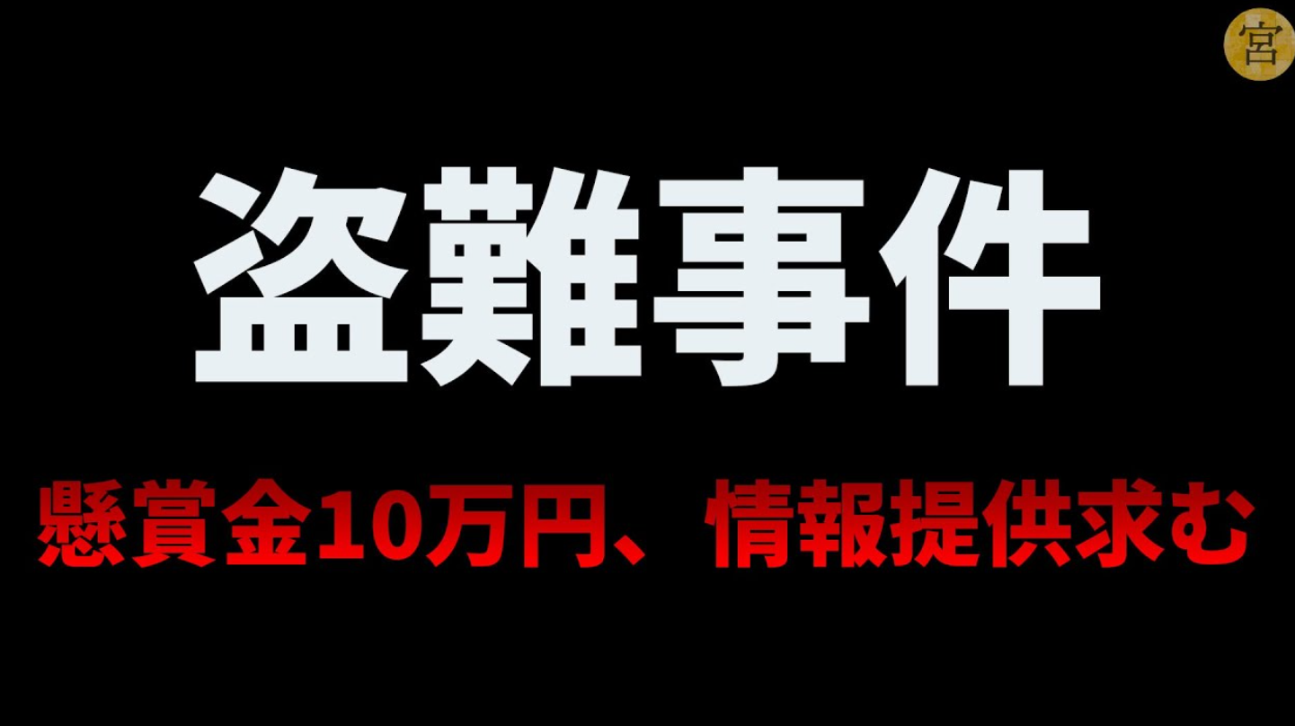 11月9日、宮迫さんは自身のYouTubeチャンネルに「【盗難事件】犯人の情報をくれた方に10万円払います」というタイトルで動画を投稿。異例の懸賞金提案をしていたようです。