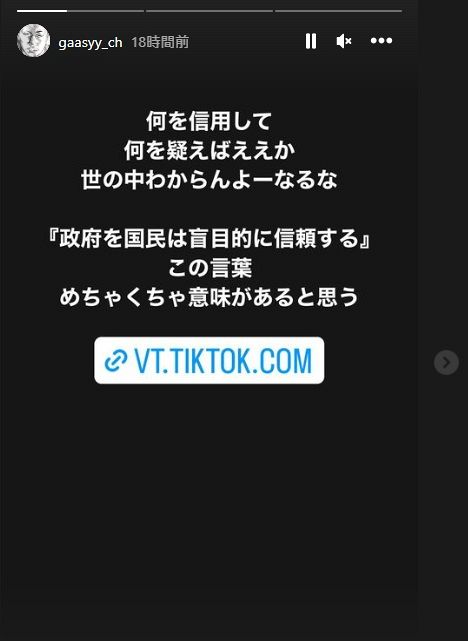 8日夜、インスタグラムのストーリーズで、TikTokのある動画のリンクを添え、「何を信用して 何を疑えばええか 世の中わからんよーなるな 『政府を国民は盲目的に信頼する』 この言葉 めちゃくちゃ意味があると思う」と意味深なメッセージを投稿。