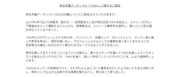 「芸能界から次の場所へ向かう」とし、第一線から身を引いてクリエーターに転身する意向を示している アイドルグループ「TOKIO」の長瀬智也(41)さんが 来年3月いっぱいでジャニーズ事務所を退所することを 22日にファンクラブサイトで発表しました。