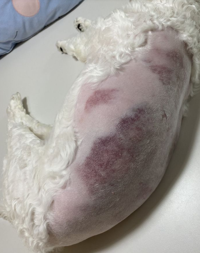 しかし、今回ペットシッターに事情があって世話を頼めないとのことで、インターネットで評点がよさそうなペットホテルを検索し、ペットを預けました。ところが、ペットホテルから3日ぶりに帰ってきてみると愛犬の行動がおかしかったのです。いつも活発で愛嬌あふれる姿は影も形もなく、元気のない状態で家族を避けました。不審に思ったユン氏は、ペットを連れて動物病院に行き検査を受けました。毛を洗った結果、なんと全身があざだらけだったのです。