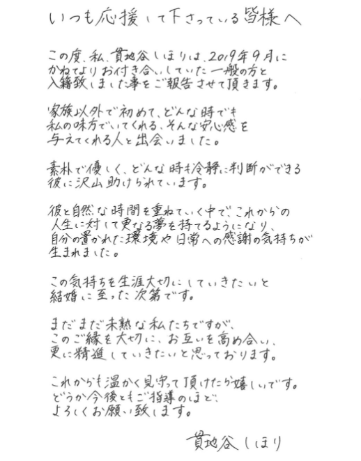 貫地谷さんは19年9月に一般男性と結婚。同月24日にインスタグラムを更新し、手書きのメッセージで入籍したことを報告しています。