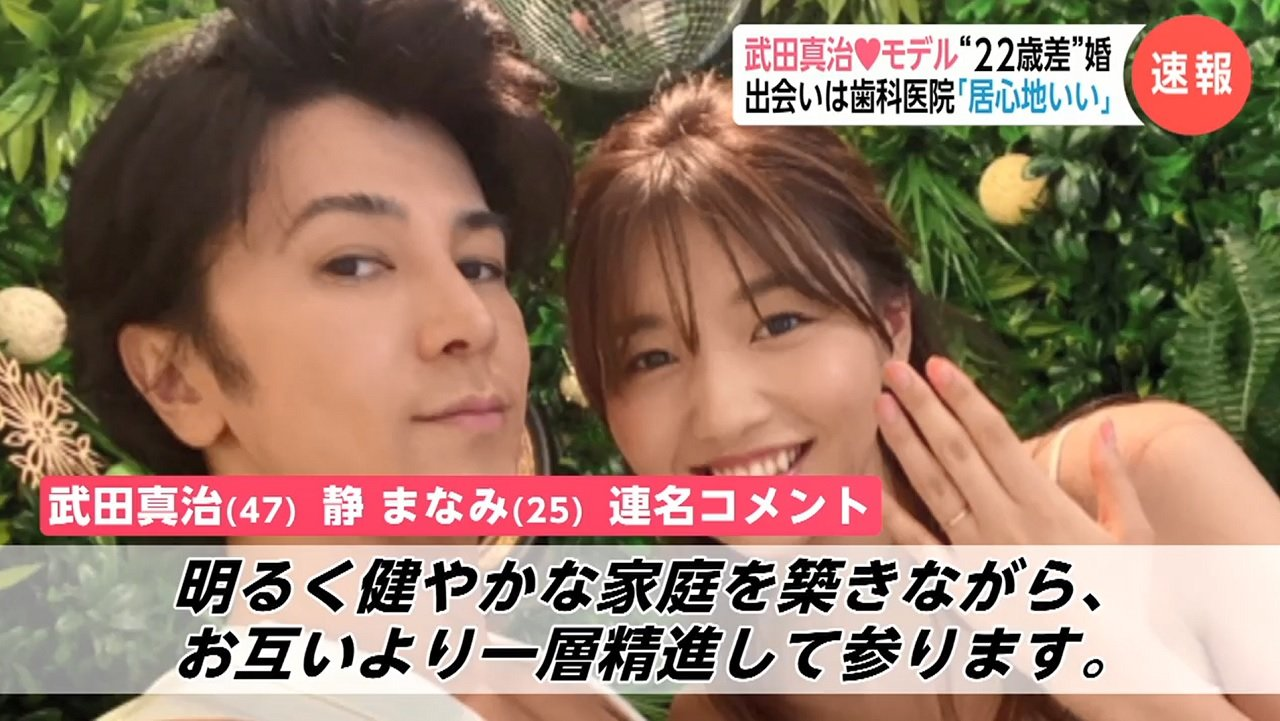 2日、俳優の武田真治さん(47)と歯科衛生士でモデルの静まなみさん(25)が 結婚したことが 分かりました。所属事務所が発表しました。