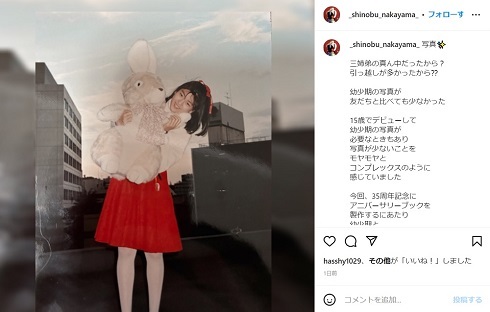 女優の中山忍が、今月6日までにインスタグラムを更新し、10代の頃と思われる写真をアップし、話題となっています。中山は「今回、35周年記念にアニバーサリーブックを製作するにあたり幼少期と15歳でデビューしてから現在までの膨大な量の写真を集めました」とつづり、大きなウサギのぬいぐるみを抱えて微笑む少女時代の写真をアップしています。