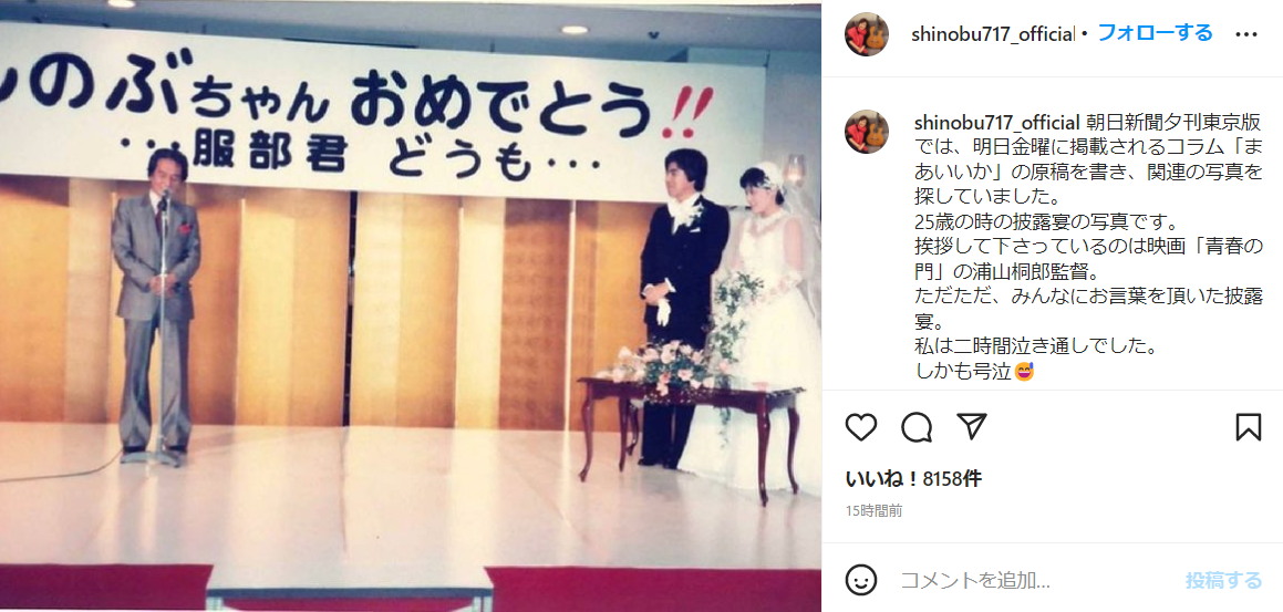 「2時間号泣!しのぶさんらしいエピソードですね」「ウエディングドレス姿、かわいい」「懐かしい貴重な写真をありがとうございます」「25歳のしのぶちゃん可愛いかった。覚えています」「良い思い出ですね〜!」など称賛の声が多く上がっています。