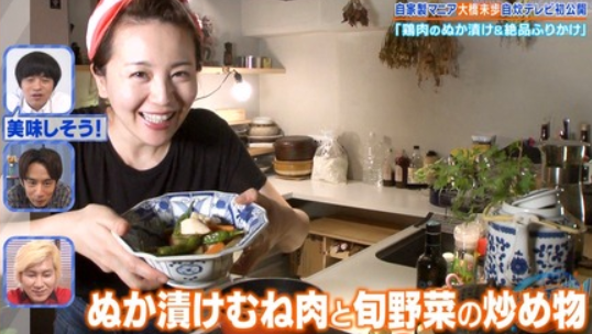 大橋アナは夫から渡されたビールを口にしながらリラックスした様子で調理し、慣れた手つきで‟ぬか漬けむね肉と旬野菜の炒め物”や‟特製のふりかけご飯”などを作り上げ、スタジオの出演者を感心させていました。
