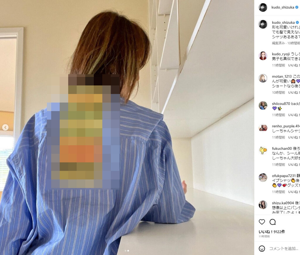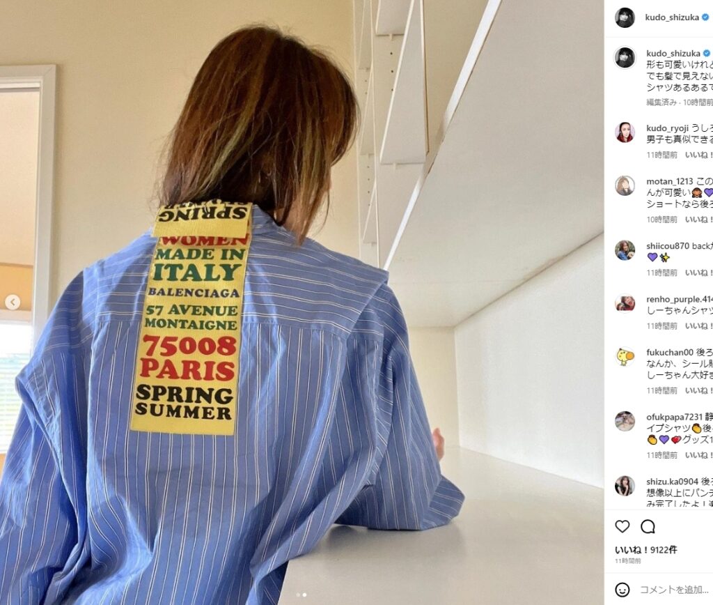 工藤は「前からあるこのシャツ。形も可愛いけれど、更に後が可愛い。でも髪で見えない‼️シャツあるあるです。笑」と綴り、2枚の写真を投稿しました。爽やかなブルーに白のストライプが入った大きめのシャツを身にまとい、気怠くカウンターに寄り掛かる姿と、その後ろ姿を公開します。後ろに黄色い大きなタグがついてあるのがポイントなのに、工藤の長い髪だと、せっかくのタグが見えなくなってしまうという話です。
