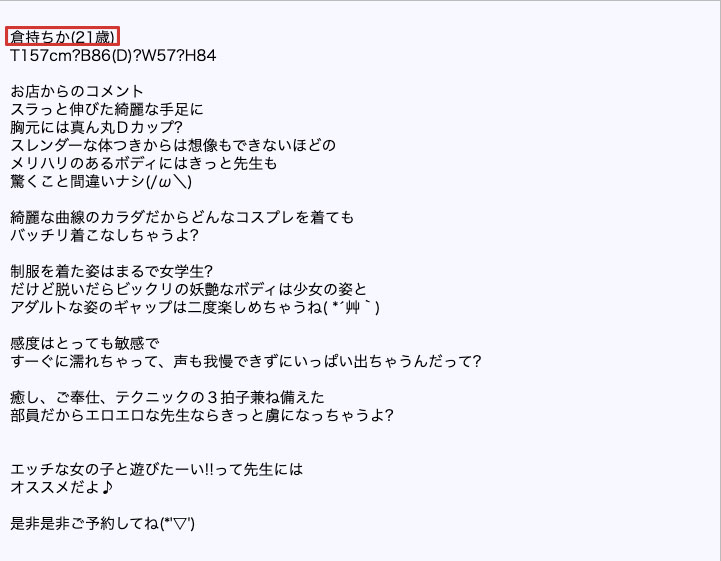 ホームページのよると、源氏名がK。21歳となっており、プロフィールによれば、<胸元には真ん丸のDカップ スレンダーな体つきからは想像もできないほどのメリハリあるボディ><綺麗な曲線の身体からどんなコスプレを着てもバッチリ着こなせる><制服を着た姿はまるで女学生>とPRしています。