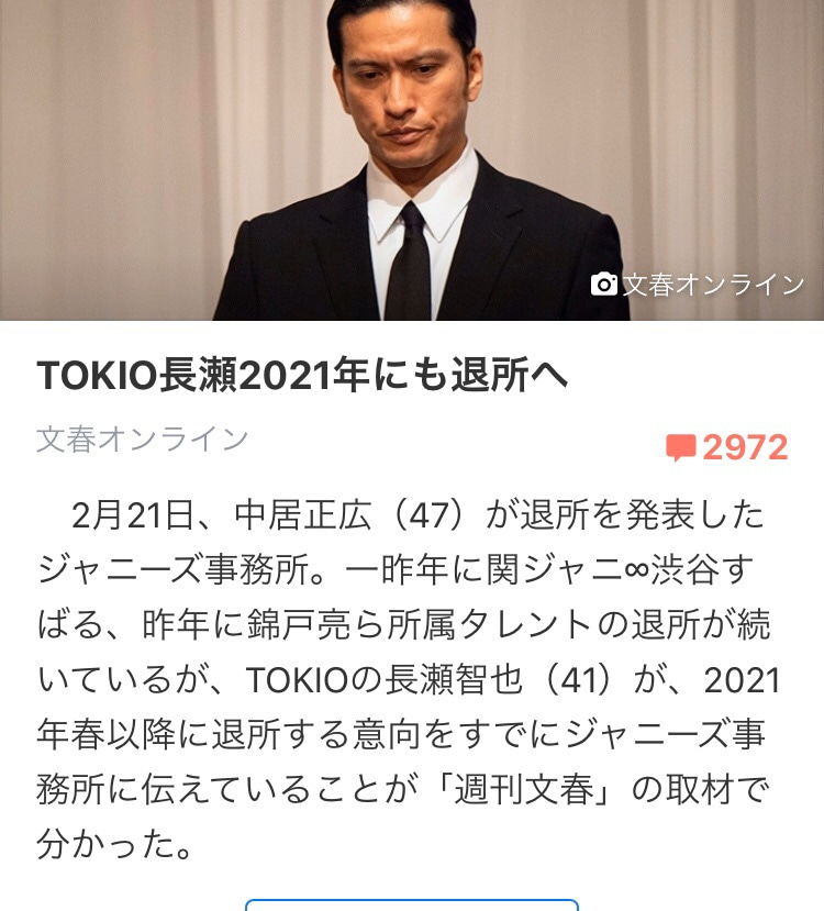 先日、TOKIOの長瀬智也さんが、文春オンラインが、来年2021年4月をもって、ジャニーズ事務所を退所する予定だということを報じ、大きな話題となりました。長瀬さんといえば、TOKIOの顔でありボーカル。どうなってしまうのかと心配なファンも多い中、なんと今度はあの人も退所するそうで・・・