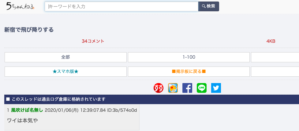 さらにその後発覚したのは、実はこの男性はネット上の5ちゃんねるに、自殺するということを書き込んでいたというのです。男性はこの6日の12時39分に「新宿で飛び降りする」というタイトルでスレッドをたてて、「ワイは本気やで」などと書き込み、自殺を示唆していました。