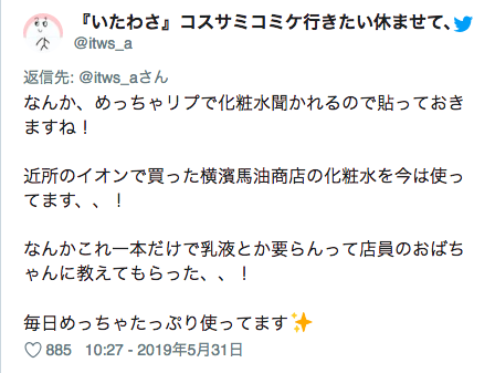 美肌の秘訣については彼女は「なんか、めっちゃリプで化粧水聞かれるので貼っておきますね!近所のイオンで買った横濱馬油商店の化粧水を今は使ってます、、!なんかこれ一本だけで乳液とか要らんって店員のおばちゃんに教えてもらった、、!毎日めっちゃたっぷり使ってます」と話しています。