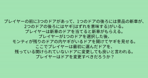 解説を行うのが困難なほど難しい問題のため、詳細が気になる方は「モンティ・ホール問題」で検索していただければと思います。