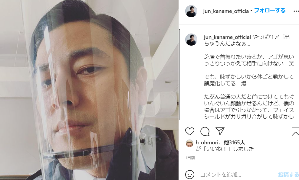 さらに、27日には自身のInstagramを更新。要さんがフェースシールドをかぶっている写真をアップしているのですが、「やっぱりアゴ出ちゃうんだよなぁ…」とアゴがにょっきりはみ出て苦労している様子。