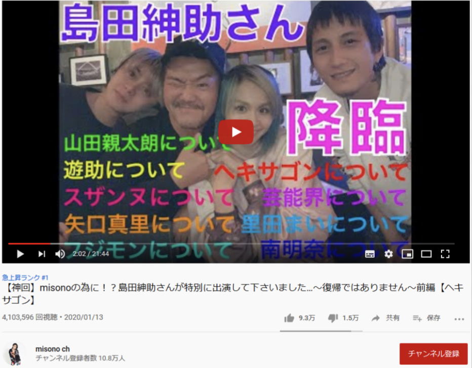 2月10日、歌手のmisonoさんが自身のYouTubeチャンネルで動画を更新。misonoさんは以前「公開しないかもしれない」と匂わせていましたが、1ヶ月の時間をかけて島田さんの後編動画を公開しました。前回の動画は約580万回再生にものぼり、島田さんのテンポの良いトークが大きな反響を呼んだことから、芸能界では活動復帰を望む声も多く上がっていたほど。