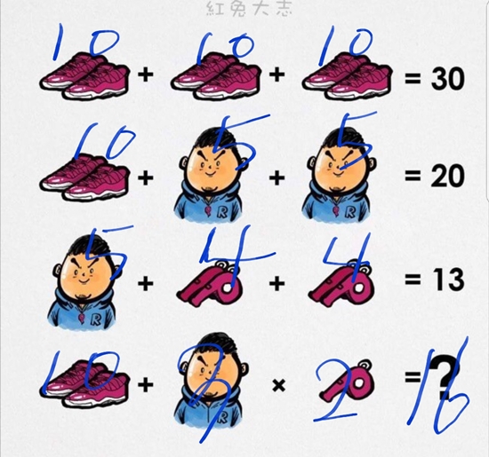 スニーカー3足の合計が30です。スニーカー1足に男の子2人を足すと20、男の子1人にホイッスルを4つ足すと13になります。