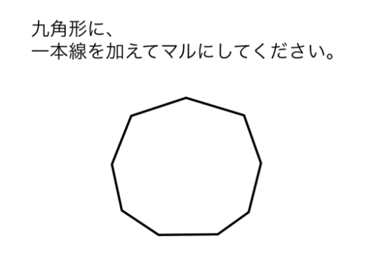 「九角形に、一本線を加えてマルにしてください。」頭が柔軟な人は5秒で解けちゃう!? 今回ご紹介するのは脳トレクイズです。 問題 : 九角形に、一本線を加えてマルにしてください。 Google Google ADVERTISEMENT あなたはわかりましたか? それでは答え合わせに行きましょう! Google 答えは、、、 「九画形の「九」の字に一本線を加えて「丸(マル)」にする。」 ADVERTISEMENT 図に線を加えるのではなく、問題文の「九」の漢字に線を加えるという問題でした。 Google ADVERTISEMENT あなたは間違えずに解けたでしょうか! [著作権者VONVON /無断コピー、無断転載および再配布禁止(違反時の法的措置)]