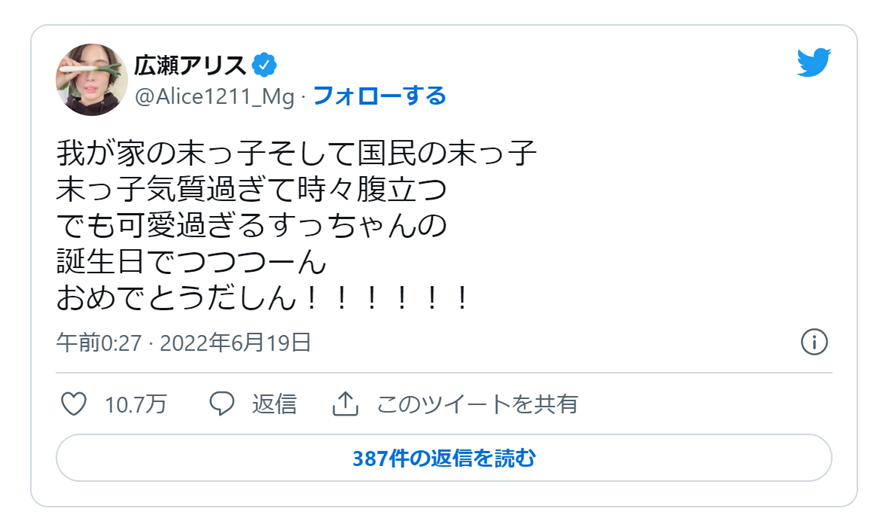 姉・アリスさんは今月19日に自身のツイッターで妹・すずさんの誕生日を祝ったことを報告しました。「我が家の末っ子 そして国民の末っ子 末っ子気質過ぎて時々腹立つ でも可愛過ぎるすっちゃんの誕生日でつつつーん おめでとうだしん!!!!!!」と綴りました。