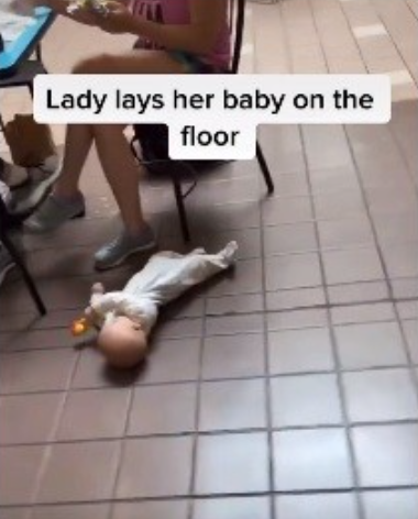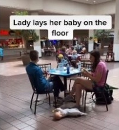 生後6か月未満と思われる赤ちゃんは床に直に寝かされたままカップルはフードコートのテーブル席で食事をしており、床の上にはブランケットも何も敷かれておらず、赤ちゃんは片手におもちゃを持ち、手足をバタバタとさせてじっとしていない様子です。