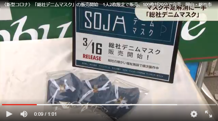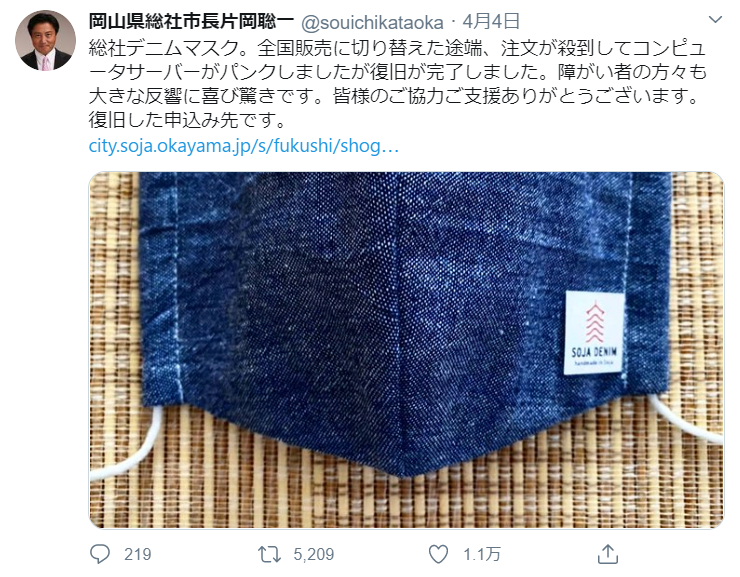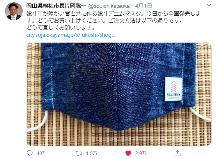 総社市の片岡市長が、「総社市が障がい者と共に作る総社デニムマスク。今日から全国発売します。どうぞお買い上げください」と、1日にツイートしたところ、大反響に…。