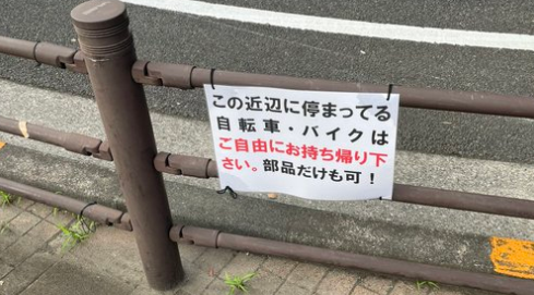 「東京スゲェな」というコメントともにツイートされた投稿には、車道と歩道の間に設置されたガードパイプの写った写真が添えられ、こちらにはなんと「この近辺に停まってる自転車・バイクはご自由にお持ち帰り下さい」という説明の書かれた張り紙が貼ってあったのです。