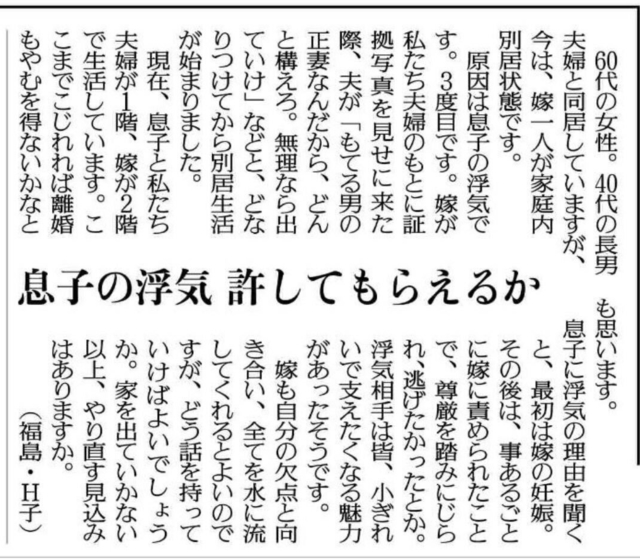 今回は当事者からの相談ではなく、家庭を持つ40代の息子の浮気に頭を抱える母親からの相談です。一体どんな話が待っているのでしょうか。詳しく見ていきましょう。