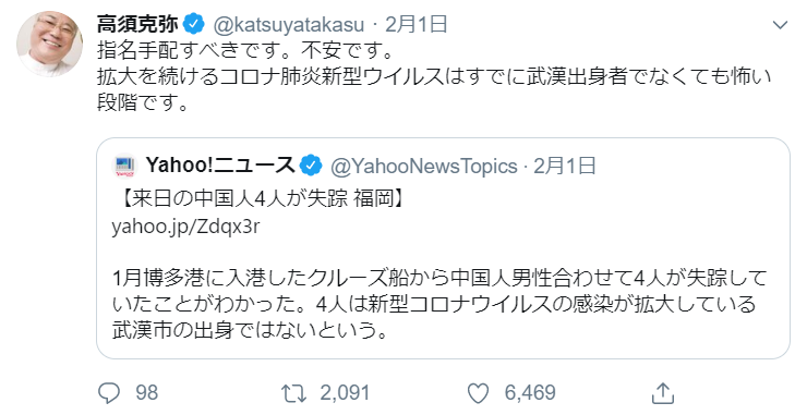 高須クリニックの 高須克弥院長が 去る2月1日、ツイッターを更新し、「来日中国人4人の失踪」のニュースをとりあげ 新型コロナウイルスについて言及しました。