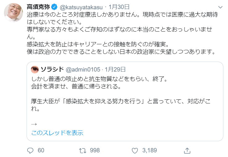 去る1月30日にも 高須克弥院長が自身のツイッターを更新。感染者が拡大している新型コロナウイルスについて見解を示しました。