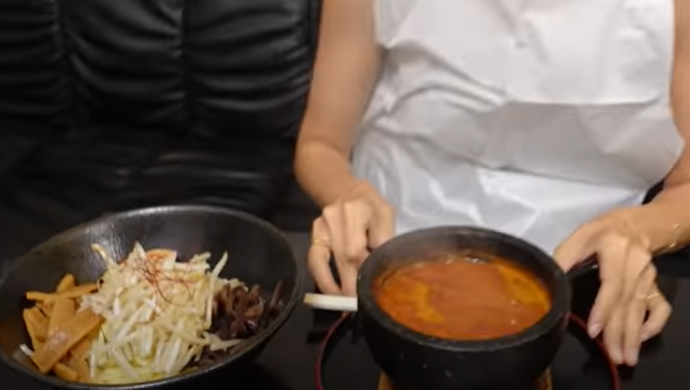 ぐつぐつ煮える石鍋に入った真っ赤な激辛のつけ汁に、麺の上には炙りチャーシュー、煮卵、もやし、メンマ、きくらげなど具沢山。