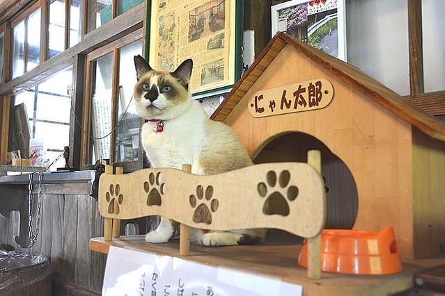 鼻と両目の周囲が黒っぽく、どこかタヌキのよう。でも、透き通ったブルーの瞳が、なんとも上品で美しい、白と茶の毛並みの美しい猫がいました。「この子が嘉例川駅で『観光大使』を務める“にゃん太郎”です」と、嘉例川地区活性化推進委員会委員長の山木由美子さん(68)は紹介します。山木さんが首もとを優しくなでると、にゃん太郎はうれしそうに目を細めました。