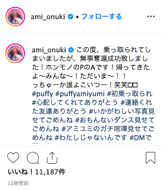 今月7月29日、「PUFFY」の大貫亜美さんが、“乗っ取り被害”に遭っていた公式Instagramのアカウントを奪還したことを報告しました。今回の騒動をファンに謝罪しつつも、大貫さんらしい緩めのユーモアで笑いに変えています。乗っ取りでは外国の喧嘩などが投稿されたようですが・・・