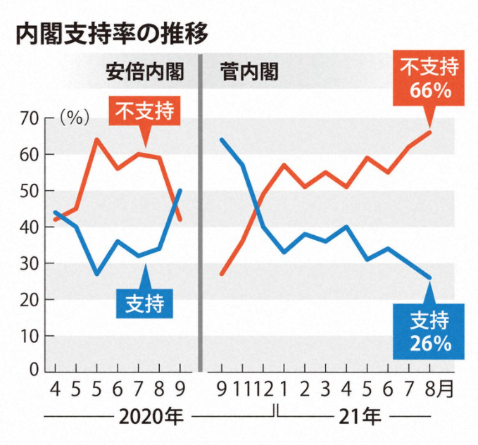 毎日新聞と社会調査研究センターが8月28日に実施した全国世論調査では、菅内閣の支持率は7月17日の前回調査の30%から4ポイント下落し、26%を記録。2020年9月の政権発足以降で初めて30%を切り、各社調査方法は様々ですが、数字の上では過去最低を更新しました。