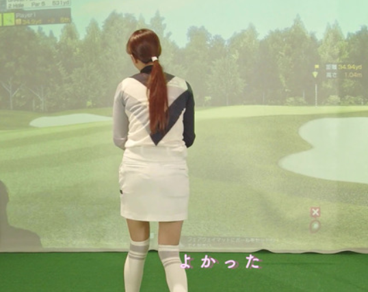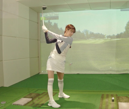 室内のスクリーンゴルフを楽しむ様子が収められています。