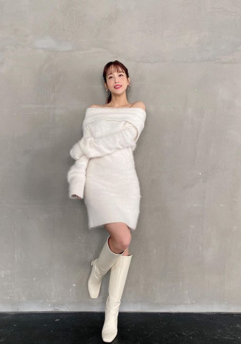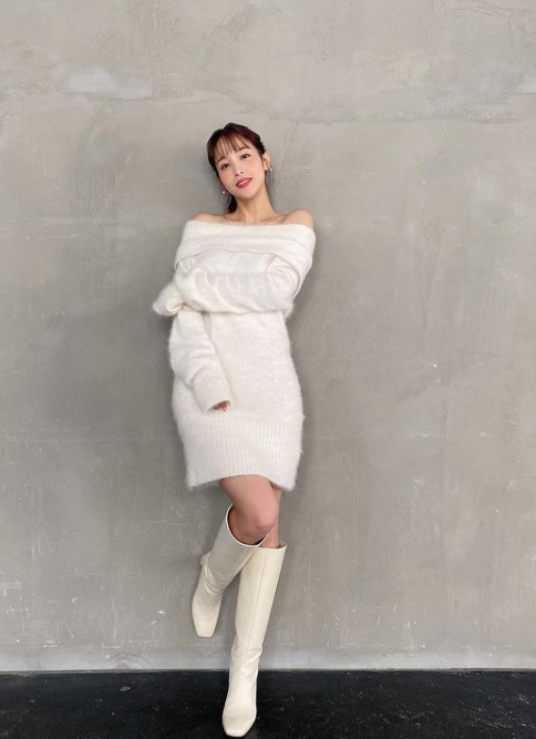 肩出しの白ニットワンピースに白ロングブーツをはいたオールホワイトコーデをした鷲見さん。