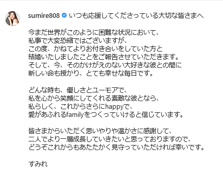 すみれさんは昨年11月に一般男性との結婚&妊娠の知らせを明かしました。