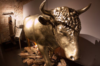 ファラリスの雄牛は、古代ギリシアで考案された真新しい拷問の方法です。牛型に鋳造された真鍮の中は空洞になっており、胴体に取り付けられている扉から人を入れることができます。罪人は、この牛の中に閉じ込められ、外から鍵をかけた状態で、牛の下から焚かれた火で、装置全体がほんのりと黄金色になるまで熱せられ、中の人間は時間をかけてあぶり殺されていくというものです。内側で上げられる叫びは、複雑な構造をした牛の口を通ることで、外側で聞く者の耳にはあたかも牛が泣いているような声となって聞こえるそうです。