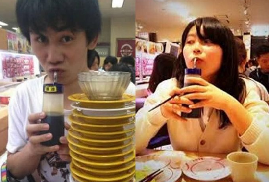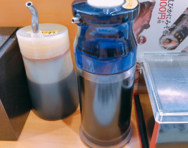 この記事の写真には、日本人がお寿司のチェーン店で醤油の容器を持ってポーズをとっている姿ですね…。