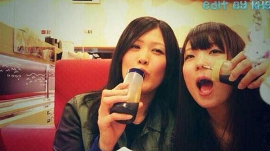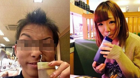 写真の中の日本人たちは、醤油の容器についている醤油が出る先端部分を口周辺に持っていき、くわえているように見せかけているのか、もしくは口内に入れているのか…