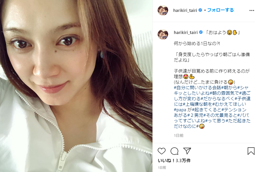 平さんは自身のInstagramにて「『おはよう』 何から始める1日なの⁈ 『身支度したらやっぱり朝ごはん準備だよね』 子供達が目覚める前に作り終えるのが理想(なんだけど…たまに負ける)」「#自分に問いかける会話」とおちゃめなキャプションを加えて、1枚のセルフィーを公開しました。