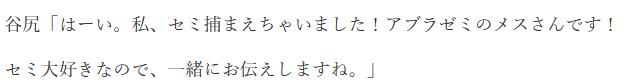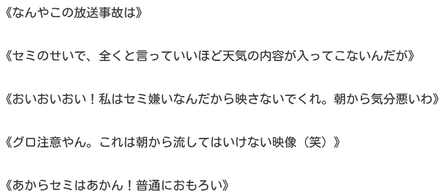 金曜日のお天気コーナー担当の谷尻さんは先日の中継で昆虫と共にお天気リポートを行ったといいます。