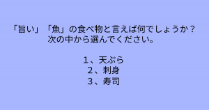 ”天ぷら 、刺身 、寿司” 問題文をよく見て解いてみましょう 今回ご紹介するのは脳トレクイズです。 問題 「旨うまい」「魚」の食べ物と言えば何でしょうか? 次の中から選んでください。 1、天ぷら 2、刺身 3、寿司 Google ADVERTISEMENT Google あなたはわかりましたか? それでは答え合わせに行きましょう! Google 答えは、、、「寿司」 ADVERTISEMENT 「魚」に「旨」を加えると、「鮨」と言う漢字になります。鮨だけに、3番の「寿司(鮨)」が答えになります。 ADVERTISEMENT Google あなたは間違えずに解けたでしょうか! Google [著作権者VONVON /無断コピー、無断転載および再配布禁止(違反時の法的措置) ADVERTISEMENT