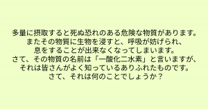 多量に摂取すると死ぬ恐れのある危険な物質があります。またその物質に生物を浸すと、呼吸が妨げられ、息をすることが出来なくなってしまいます。